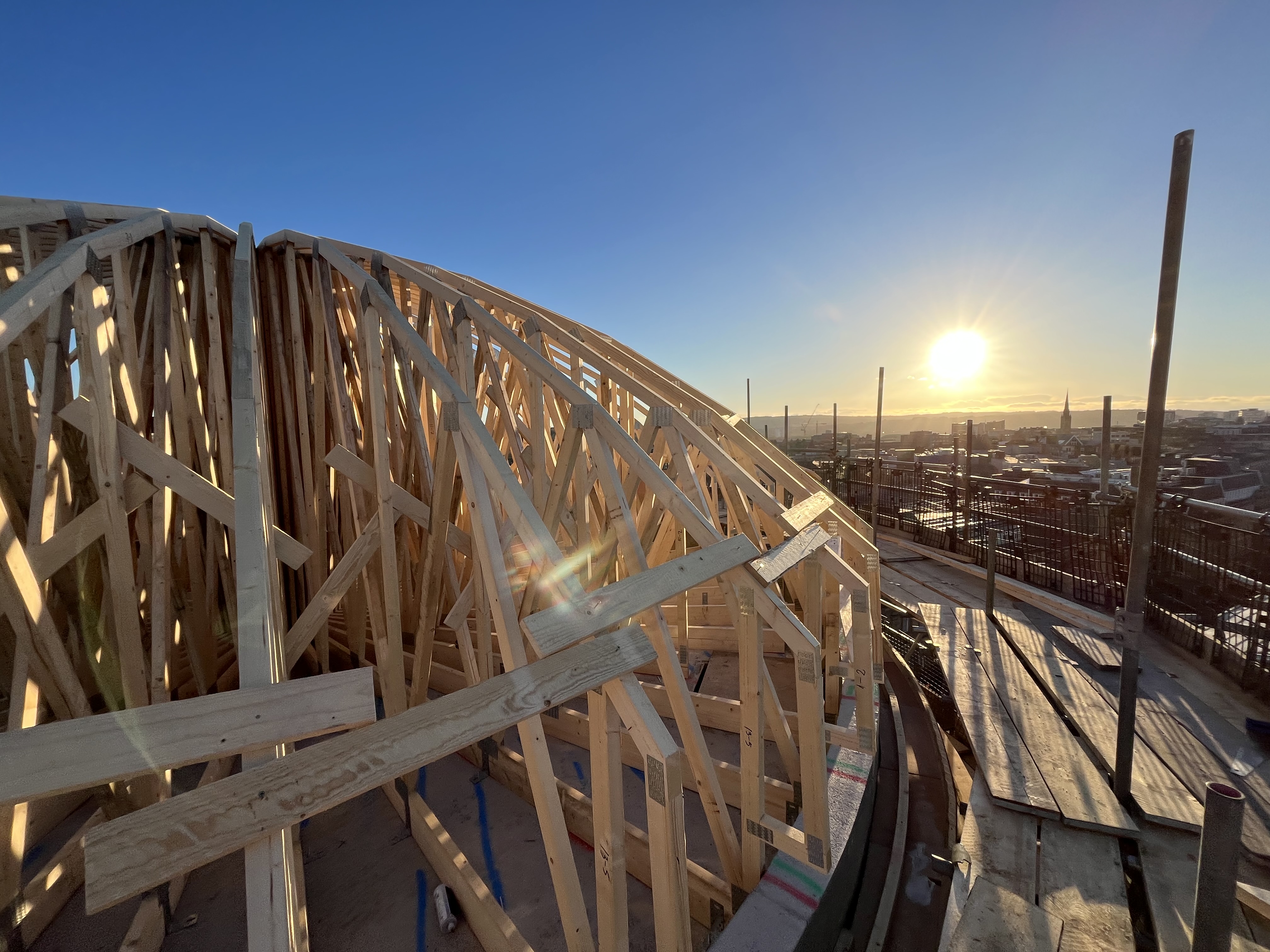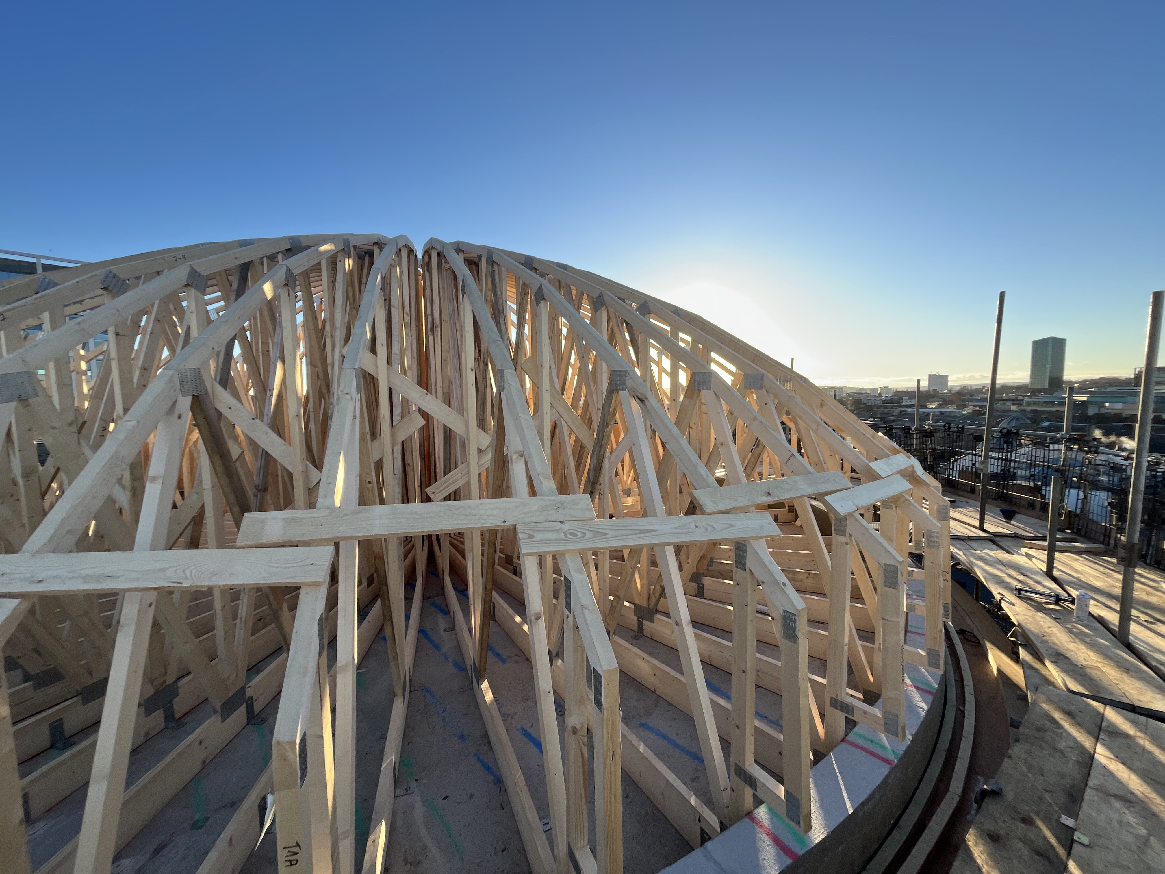 Senior Design Technician John Collins led the roof design for DTE. “This was a completely bespoke design,” he said. “Standard roof trusses are obviously triangular, naturally forming peaks and troughs. Creating a smooth dome is something we’ve only done a handful of times.